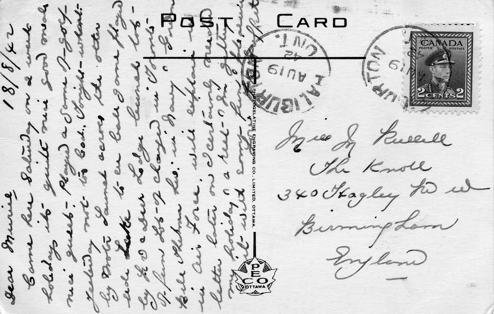It is dated August, 18, 1942 with a two-cent stamp, a Haliburton postmark and addressed to Miss M. Russell, The Knoll, 340 Flagley Rd. W., Birmingham, England. As best as can be made out, it says: